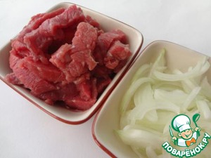 Мясо порезать длинными (3-4см) кусочками толщиной около 1см, лук - полукольцами.