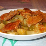 В сковороду к мясу отправляем огурцы и томатную пасту. Доливаем оставшуюся воду. Тушим до готовности мяса. Воды может потребоваться больше. Дополнительно блюдо я не солю, в огурцах достаточно соли, а вот отрегулировать вкус можно сахаром (в общем-то, это известно и без меня))) Я добавляю обычно десертную ложку.