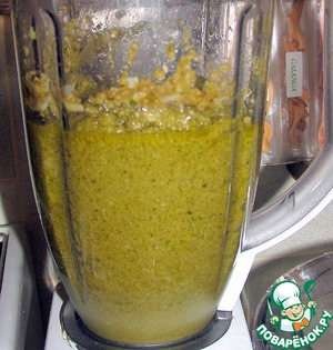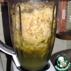 Пармезан и лепестки положить к измельчённой зелени, налить оливковое масло и всё измельчить.