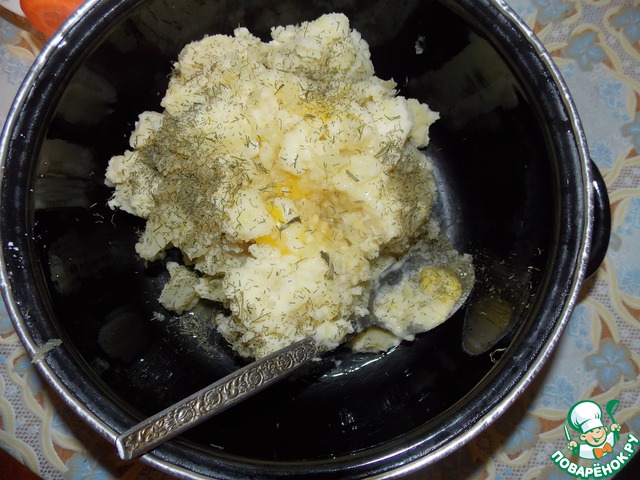 Делаем основу для котлет: в пюре добавляем приправу, яйцо и все перемешиваем.