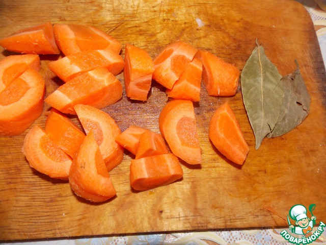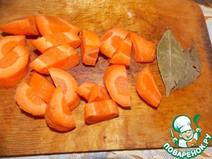 Морковку нарезаем помельче и ставим варить в подсоленной воде с добавлением лаврового листа.