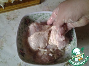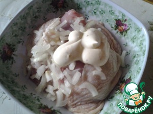 • Добавляем к бёдрам лучок (половину), майонез (у меня былв этот раз сливочно-чесночный соус), 1 ч. л. соев. соуса, 1ч. л. имбиря (молотый или свежий натереть), если надо соль, перец молотый по вкусу, натёртый на мелкой тёрке 1 зубок чеснока.