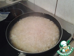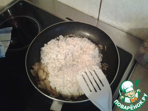 • Через 2-3 мин. залить водой (можно любым бульоном) на 2 см выше риса, накрыть крышкой и тушить на медленном огне до готовности около 20 мин.