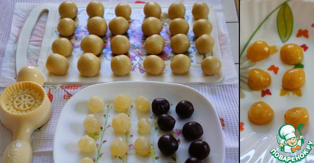 Идея делать начинку из рахат-лукума для меня была очень новой, но эта начинка - одна из моих самых любимых. Я покупала обычный рахат-лукум в коробке, слегка посыпанный сахарной пудрой. Из него очень легко сделать шарики. -
