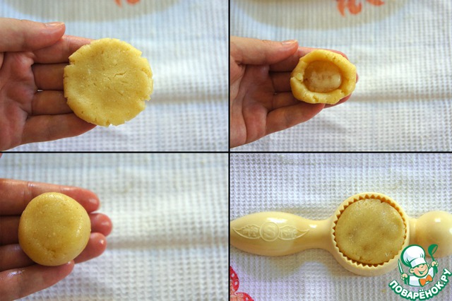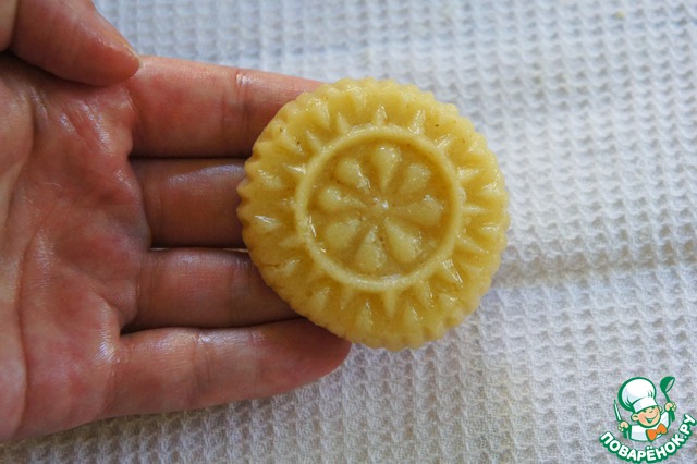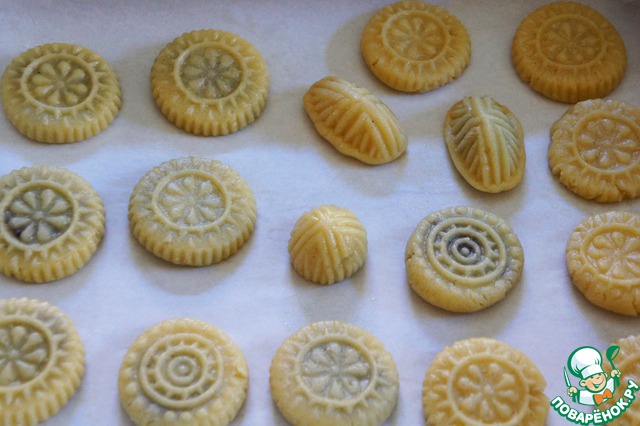 Принцип формирования печенья схож с печеньем кахк, о котором я уже рассказывала. Возьмите 1 шарик теста, чуть его расплющите, положите в серединку шарик начинки, обтянув ее тестом. Соедините кончики теста в шар, покатайте его между ладонями, чтобы тесто плотнее облегало начинку. В специальную форму необходимо выложить чуть приплюснутое сформированное печенье, и плотно прижать его ладонью к формочке. Вы можете сделать печенье в виде маленьких пряников, аккуратно украсив поверхность печенья наколами или полосочками вилки/ножа. Тесто очень податливое, с ним приятно работать.
