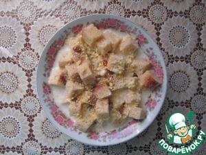 • Срезать с хлеба корочку. Хлебную мякоть нарезать кубиками.