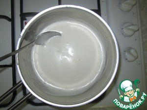 • Готовим соус: смешать вино, оставшееся яйцо, сахар и крахмал. Варить на медленном огне, помешивая, до тех пор, пока не образуется пенистая масса.