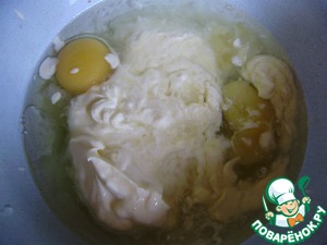 В другой миске смешайте яйца, сметану, растительное масло и лимонный сок.