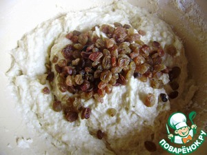 Влейте яично-сметанную смесь к муке с сахаром. Размешайте тесто до однородности и добавьте изюм.