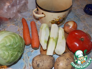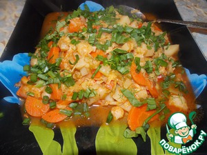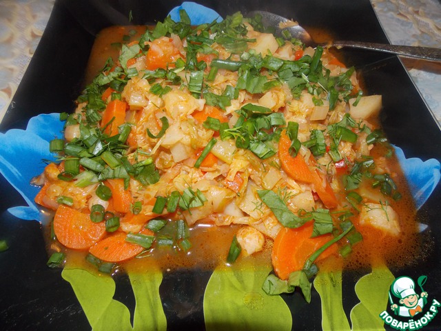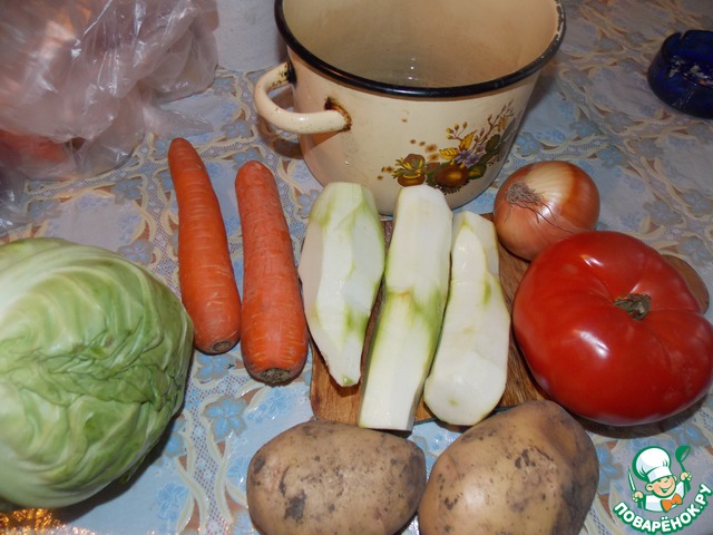 Все нарезать в кастрюльку и поставить на огонь, налив туда, примерно, 2 стакана воды и тушить минут 30, затем положить томатную пасту и соль, все перемешать и тушить минут 10... И блюдо готово..