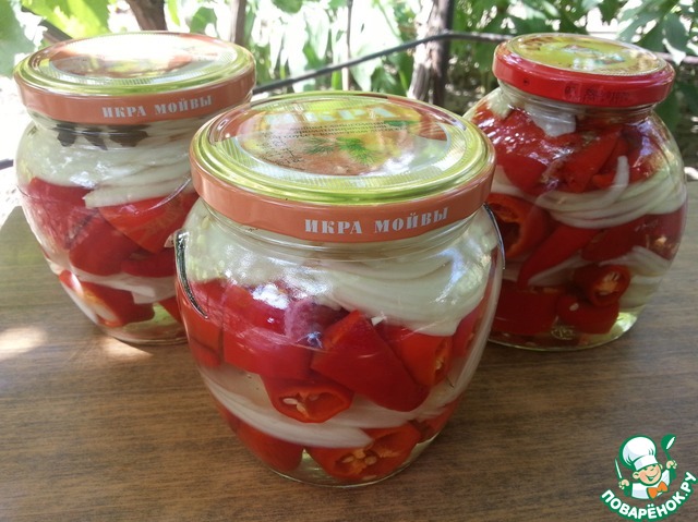 Берём острый перец, очищаем от семечек, режем колечками или наискосок. Лук режем колечками (у меня лук был крупный порезала полукольцами). Чеснок нарезаем произвольно. Всё тщательно перемешиваем. (При обработке перца наденьте перчатки, иначе руки будут гореть целый день! Научена на собственном горьком опыте).