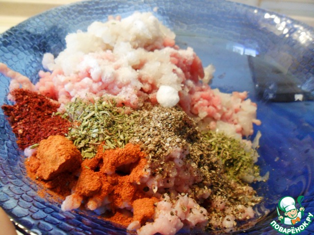 Проверните мясо и 100 г лука (1 головка лука), добавьте специи - по 1 ч. л. молотого черного перца, кориандра, паприки, сушеных томатов, чабреца. -