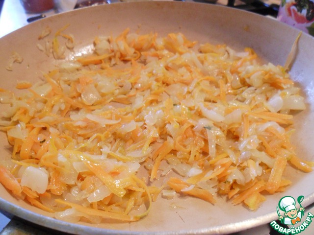 Измельчите лук и чеснок - обжарьте их до прозрачности в сковороде на растительном масле, натрите на крупной терке морковь и половину ее добавьте обжариваться на сковороду к луку. Когда зажарка будет готова - переложите ее в фарш, добавьте рюмку воды, вина (тоже рюмку) и промытый рис.