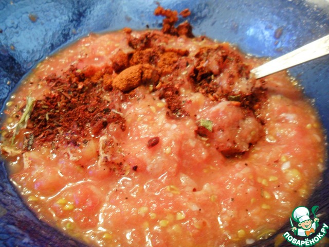 Теперь готовим соус для наших перчиков, в котором они будут вариться. В оставленный нами фарш трем очищенные помидоры, добавляем по 1/2 ч. л. черного перца, сушеных томатов, паприки, корицу на кончике ножа, 1 измельченную коробочку кардамона и остальное вино.