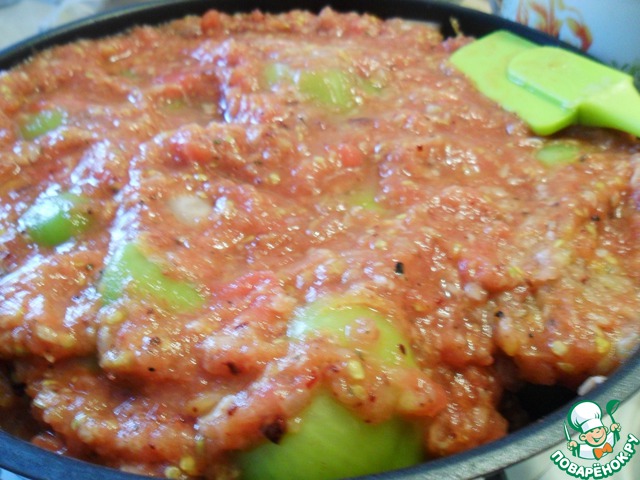 Все тщательно перемешиваем и заливаем этим соусом перчики. Если жидкость не укрывает перцы - долейте воды, посолите и накройте крышкой. Если жидкость будет выпариваться - периодически доливайте ее. 60 минут - и блюдо готово. Для приготовления достаточно и 45 минут, но я люблю добавить еще минут 15, чтобы соус слегка загустел, и перчики были слегка "утомленными".
