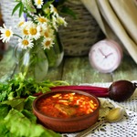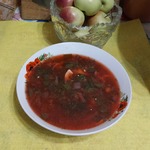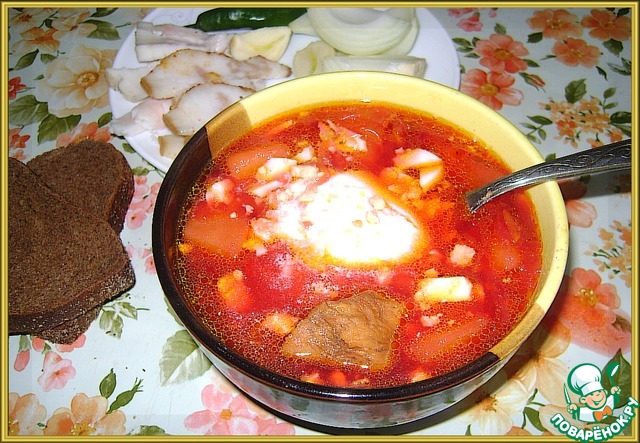 Даем поварится мясу минут 30-40, затем добавляем картофель и варим еще минут 20... Затем добавляем поджарку из лука и моркови, свеклу и яйца, солим и добавляем лавровый лист. Варим еще минут 10 и суп готов... Можно кушать... Очень вкусно со сметаной и чесночными гренками..
