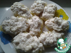 Выкладываем массу на половинки картошечки, если надо, присолите картофель.