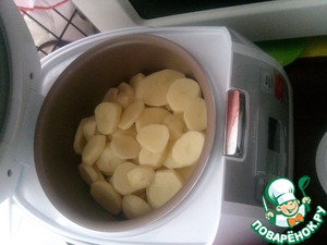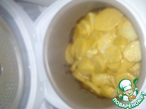 В кастрюлю мультиварки складываем поочередно куриные голени и картошку.