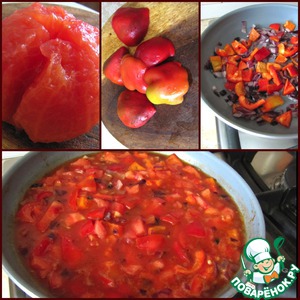 Готовим соус: в сковороде разогреть растительное масло. Добавить лук и обжаривать на среднем огне примерно 3-5 минут. Добавить сладкий перец, нарезанный квадратами, специи, воду, пассерованные томаты, томатную пасту. Довести до кипения и томить примерно 5-7 минут. Добавить перец кайен и чеснок, готовить примерно 1 минуту.