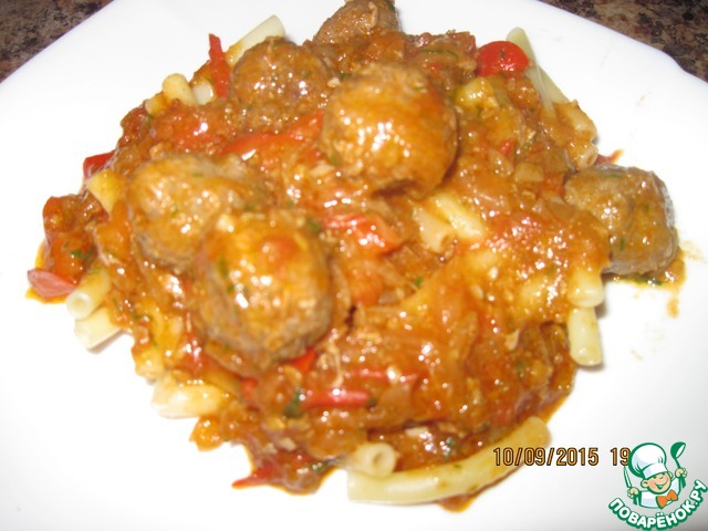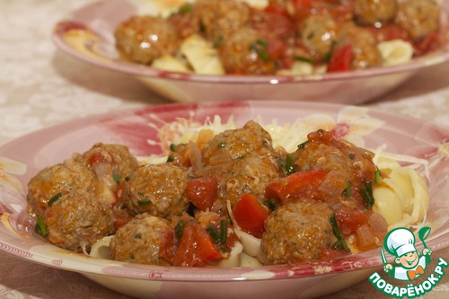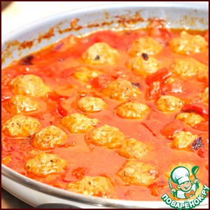 Добавить в соус фрикадельки (на этой стадии можно долить еще воды, если получилось густо) и готовить примерно 10-15 минут до готовности фрикаделек. Пробуем на вкус и регулируем состав, если паста кисловата, то можно добавить 1 ч. ложку сахара или меда. Прогреть.