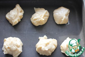 Выкладывать на лист (я его ничем не мазала и не выкладывала бумагой, отходили отлично) чайной ложкой. По консистенции тесто должно держать форму, не растекаться. У меня все на один стандартный лист не уместилось, пришлось делать в 2 захода (на фото как раз второй заход). Слишком близко на листе их не укладывайте, а то при выпечке они слипнутся, и когда будете разделять, в боку образуются дырки (у меня 2 таких было), т. к тесто нежное и тонкое.