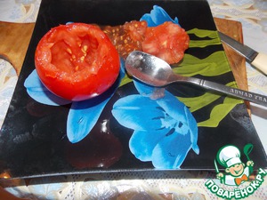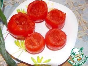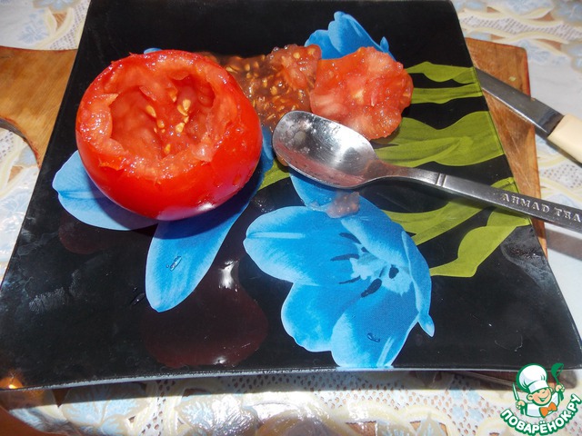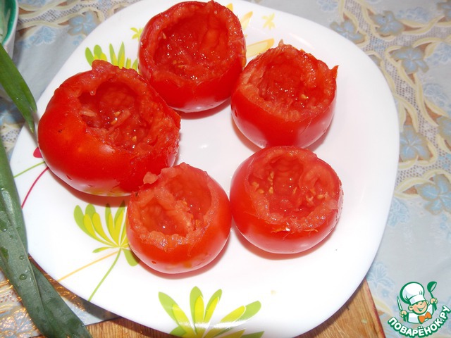 Помидоры моем, сверху срезаем шляпку и вычищаем чайной ложкой середину помидора.