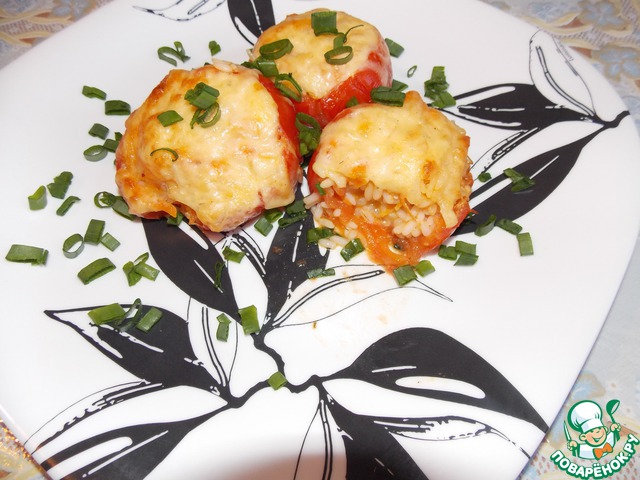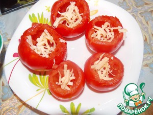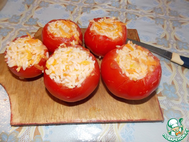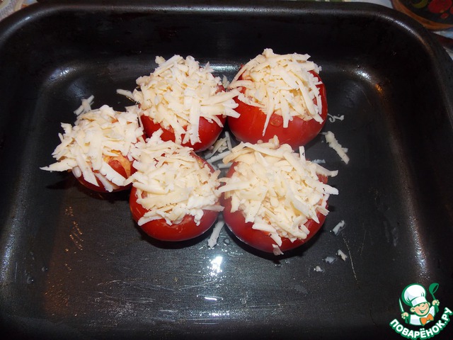 Выкладываем помидорки на противень, посыпаем сыром и ставим в духовку на 15-20 минут при 200*С.. (ну, или смотреть по появлению золотистой корочки у риса..)