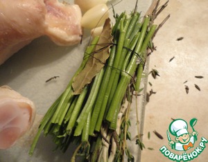 Берем 2-3 веточки розмарина, 5-6 веточек тимьяна, "хвосты" от пучков петрушки и укропа, два лавровых листа.