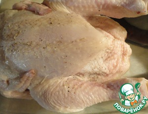 Первым делом включаем духовку и оставляем ее нагреваться до 100-120 градусов. Берем курочку. У меня был килограммовый цыпленок. Если у Вас крупная кура, то запекать надо будет на час больше. Солим и перчим внутри и снаружи. Если готовим для детей, то перец не используем.
