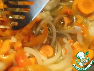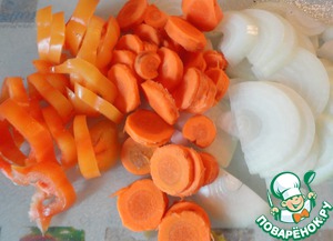 Итак, лук режем полукольцами, морковь - кольцами, перец - соломкой -