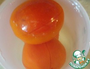 Пока овощи тушатся, подготавливаем помидоры. Надрезаем крестообразно, заливаем кипятком на 1-2 минуты.