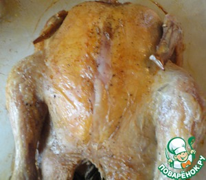Через час вынимаем куру из духовки, сливаем сок.
