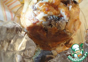 Ставим курочку на шею, заворачиваем в фольгу и оставляем минут на 10. Это нужно для того, чтобы соки, оставшиеся внутри тушки, стекли в грудку и пропитали оную. Ведь грудка - самая сухая часть курицы.