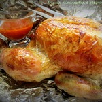 Накрываем фольгой так, чтобы она не касалась курицы. И отправляем в духовку на 3,5 часа при температуре около 100 градусов. На это время про куру можно забыть.
