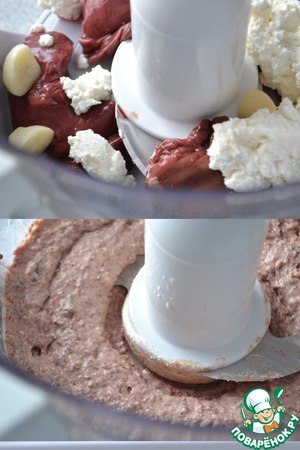 Печень, творог, чеснок измельчить в комбайне или пропустить через мясорубку.