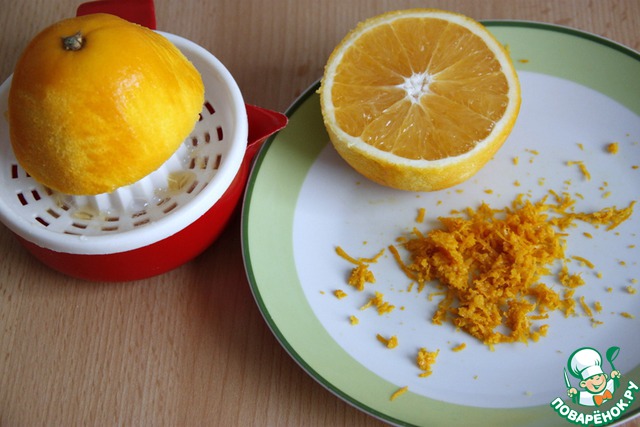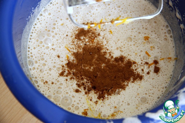 Добавить в яично-сахарную массу оливковое масло, молоко, щепотку соли, корицу, апельсиновую цедру, сок апельсина и хорошо размешать.