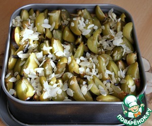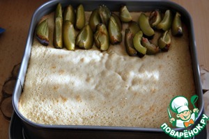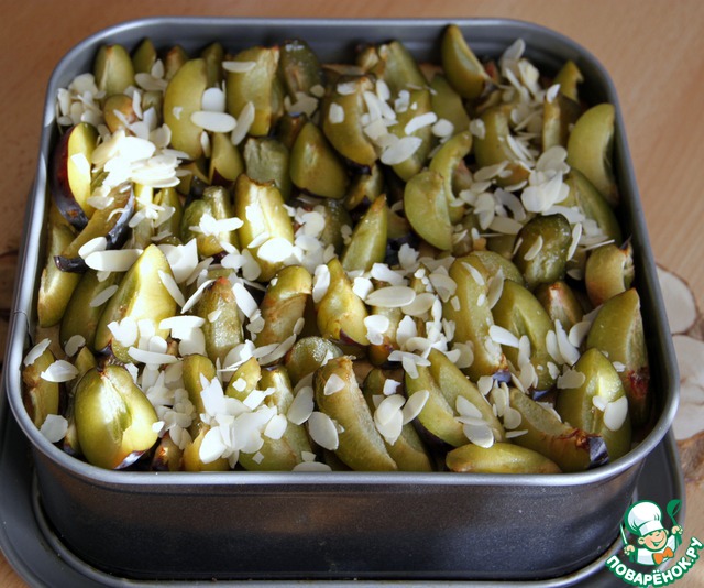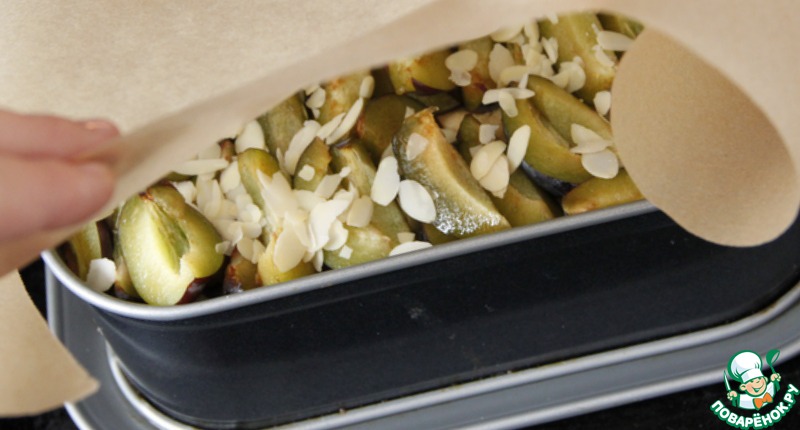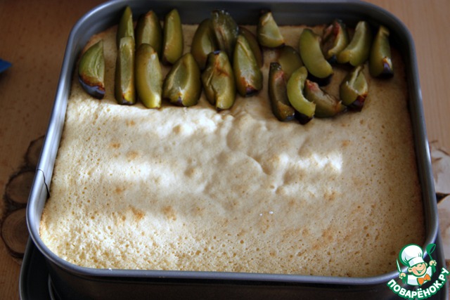 Выложить сливы очень тесно, срезом вверх на поднявшийся пирог
