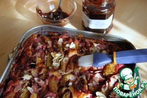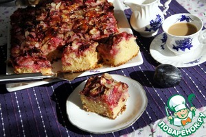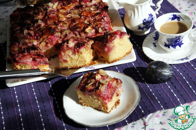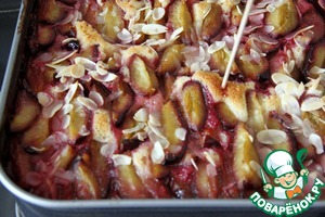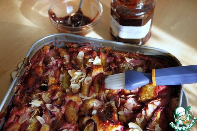 [+5](кулинар irinka-veselaja) я "погасила" разрыхлитель лимонным соком.И после каждого добавления в тесто муки и погашенного разрыхлителя оно так здОрово перемешивалось и просто на глазах становилось таким пышным и воздушным!Обожаю такую консистенцию!И вообще само тесто замечательное,на оливковом масле.Впервые такое делала!Да еще и со спельтовой мукой.Я в него еще все-таки свой любимый ванилин добавила (ну,не могу я без него) и не зря,он очень здорово вписался в общий вкус пирога!У нас сегодня такой дождь и холод на улице.мне не хотелось идти в магазин за миндальными лепестками.Я очистила миндаль от кожицы и натерла на шинковочке стружкой.Слива у меня была своя,кисло-сладкая,очень удачно и она подошла!А сливовый джем я сделала быстренько,буквально за 4 минуты в кружке в СВЧ,он у меня такой ярко красный получился!После выпечки,сняв сверху бумагу.я обнаружила,что хотелось бы сверху немного допечь,не было румянца у пирога,и я без бумаги допекла его,включив только верхний нагрев,в течении 15 минут.В общем,Нинуля,мы просто в восторге от выпечки!Огромное тебе спасибо за великолепный рецепт!Он теперь один из моих любимых!Нинуля,я отчиталась на форуме в теме "Хочу сказать спасибо",там еще фогография!