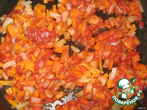 Морковку и лук нарезать кубиками, спассеровать на растительном масле. Добавить томатную пасту.