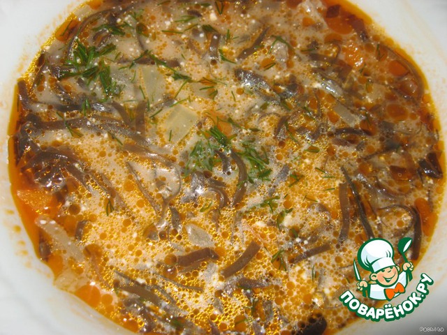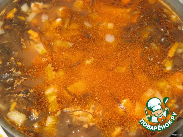 Добавить морскую капусту, затем обжарку из овощей, посолить. -
