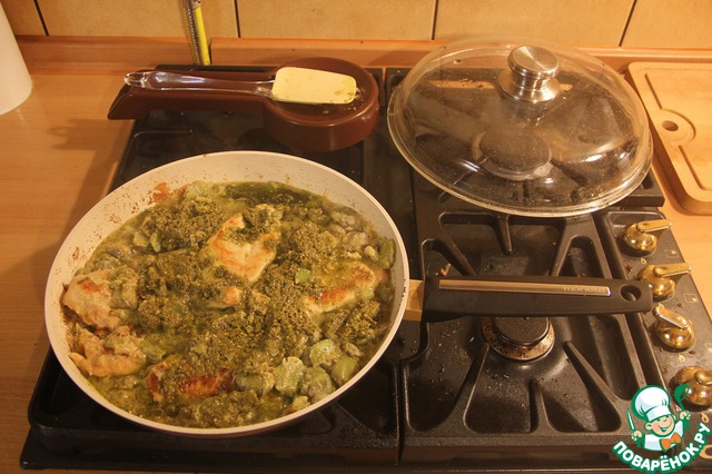 После этого добавляем соус "Песто-базилик" из баночки, полоскаем баночку с 50 мл воды и выливаем тоже в сковороду, перемешиваем и жарим-тушим под крышкой по 3 минуты с каждой стороны мяса.