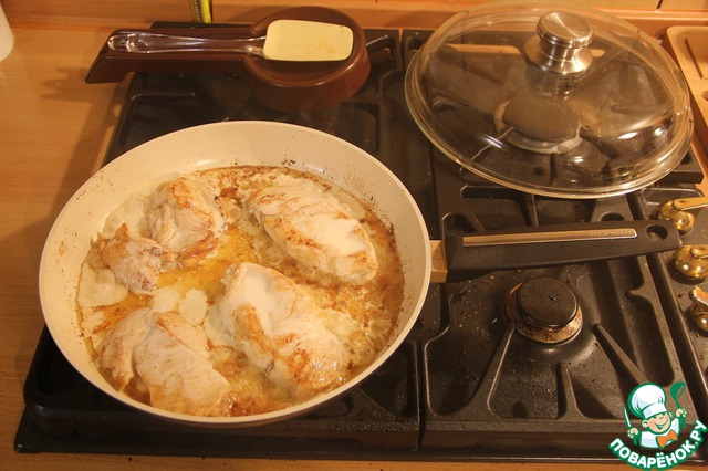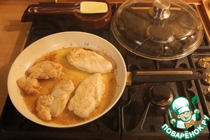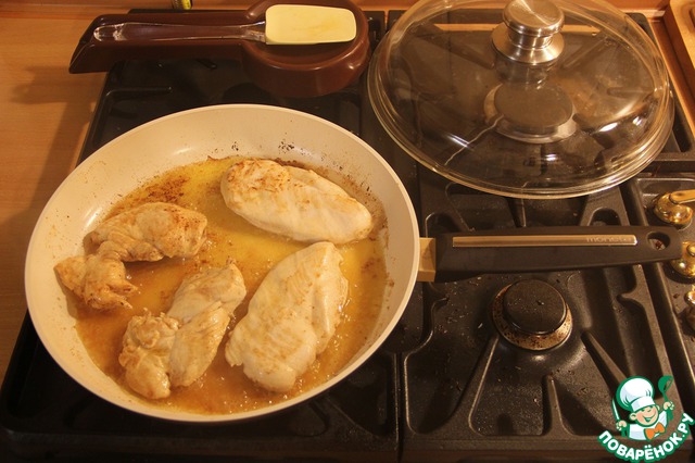 Разогреваем сковороду. Добавляем 45 г сливочного масла и обжариваем грудку под крышкой с каждой стороны по 4 минуты (до чуть золотистого цвета).