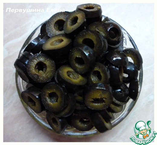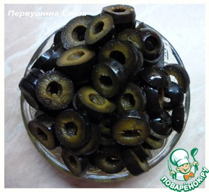 Маслины нарезаем тонкими кружочками.