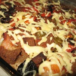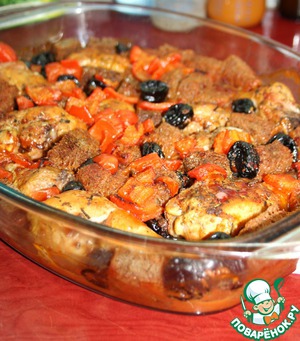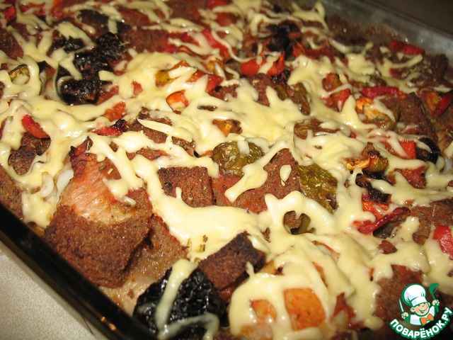 Обжаренную курицу уложите в форму для запекания, между кусочками курицы проложите кусочки хлеба и чернослив, сверху перец.