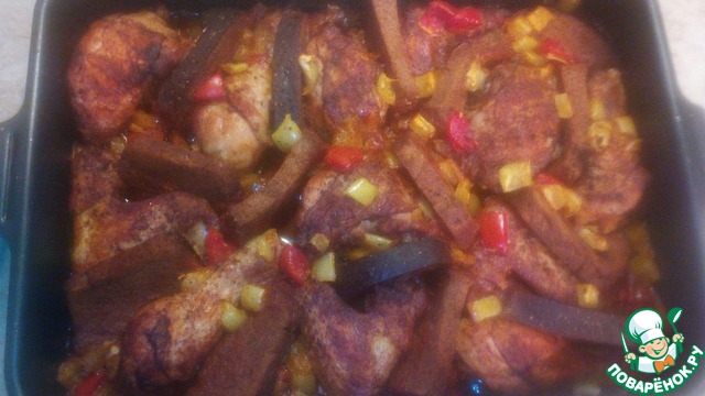 Еще учась в школе, в старших классах, услышала в какой-то кулинарной телепрограмме этот рецепт. Понравился оригинальностью и простотой приготовления, да и набор продуктов минимальный. Попробовала приготовить, потом приготовила еще раз, и еще, и еще... Это блюдо стало частым гостем на нашем столе. А потом забылось. Почему так получилось, никак не могу вспомнить. И вот совсем недавно рецепт всплыл в памяти и, как всегда, на славу удался. Поэтому и делюсь! Можно использовать любые части куриного мяса, раньше я срезала мясо с окорочков и готовила без костей, а теперь решила пустить в ход голени. Немного увеличила время запекания, восхитительный результат.