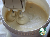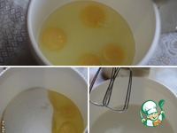 4 яйца разбить в емкость, в которой будете взбивать, к яйцам добавить 300 гр сахара и взбивать до белого цвета (я взбиваю как на шарлотку). |