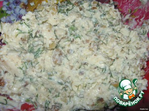 Сыр натереть на тёрке. Чеснок пропустить через пресс. Орехи потолочь (или пропустить через мясорубку). Все соединить. Добавить 3 столовые ложки майонеза, нарезанную зелень, хорошо перемешать.