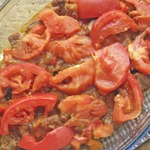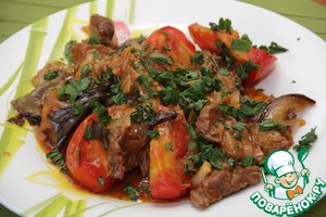 Поверх баклажанов - мясо с соусом. Сверху достаточно крупные дольки помидоров (четвертинки, если помидоры небольшие, восьмушки, если достаточно крупные). Полить вином (чуть-чуть) либо сбрызнуть уксусом (я полила бальзамическим уксусом). Поставить запекаться в духовку на 25 минут.