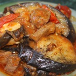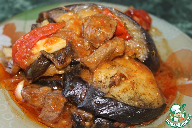 Перелить соус в кастрюльку с мясом, накрыть крышкой и тушить на среднем огне около 30 минут (пока будут жариться баклажаны).