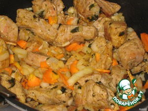 добавить порезанные овощи к мясу и обжарить 5-7 минут помешивая, затем добавить порезанный помидор и еще обжарить 5-7 минут.